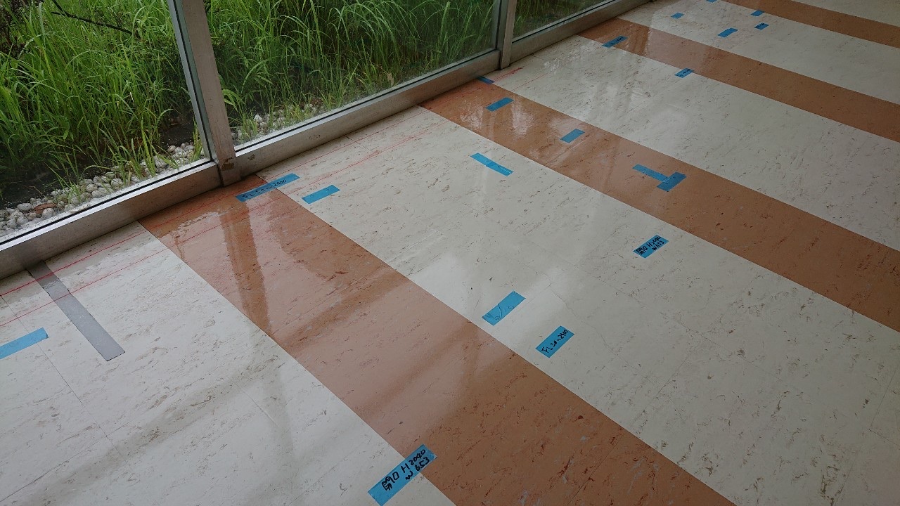 ↑ 工事前の墨出しの様子です。遠くに見えるのは新人のタサキさんです。